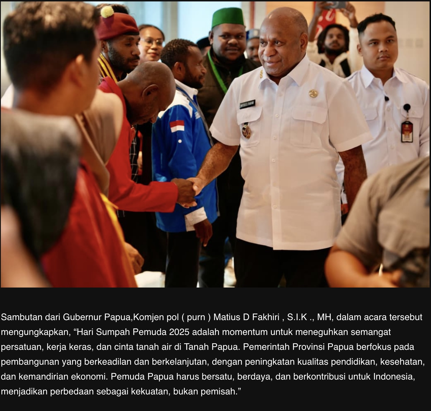 Kami pemuda-pemudi Papua bertekad dan berjanji untuk memberikan waktu, upaya, pikiran, dan hati kami untuk bangsa, negara, dan daerah kami. Satu, kami pemuda dan pemudi Papua berjanji akan bersama-sama seluruh agama masyarakat. Kedua, kami pemuda dan pemudi Papua mendukung penuh kepemimpinan dan program Bapak Prabowo Subianto sebagai Presiden Republik Indonesia. Ketiga, kami pemuda dan pemudi Papua mendukung dan siap menjadi pelaku pembangunan Papua di bawah Kepemimpinan Gubernur Papua Bapak Komjen Komjen pol ( purn ) Matius D Fakhiri , S.I.K ., MH dan Wakil Gubernur Papua Aryoko Alberto Ferdinand Rumaropen, S.P., Eng. Pernyataan sikap ini kami buat dan penuh rasa tanggung jawab sebagai generasi penerus dan pelurus bangsa Indonesia.” [red]